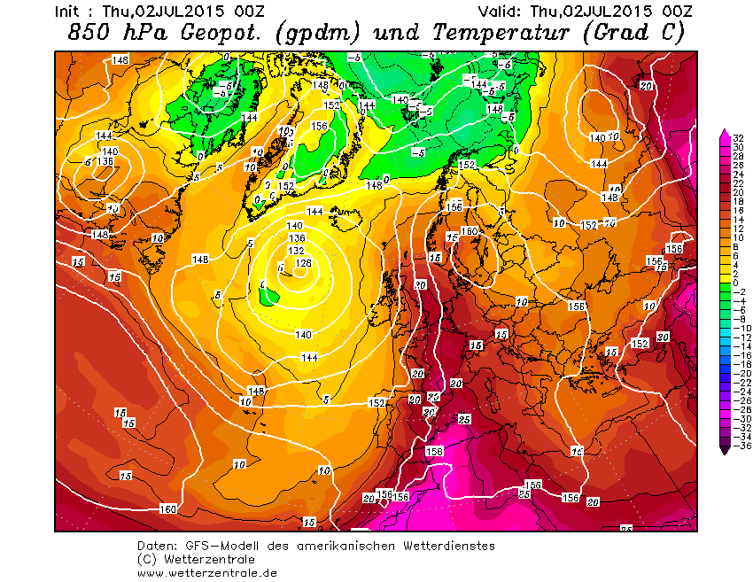 850 hPa (ongeveer 1.500 meter hoogte) - situtatie op 2 juli om 0 uur GMT